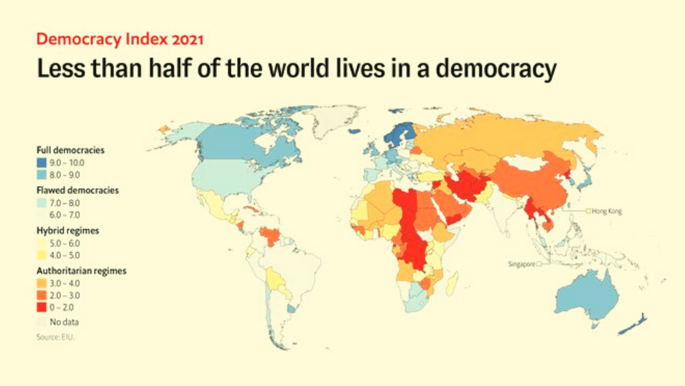 يقيم "المؤشر السنوي للديمقراطية" وضع الديمقراطية والصعوبات التي تواجهها في مختلف دول العالم. ورصد المؤشر تراجعاً جديداً للديمقراطية في 2021 حتى في أوروبا، مسجلاً أسوأ نتيجة منذ نحو 15 عاما. ولجائحة كورونا نصيب في ذلك.وقد سجلت معايير الديمقراطية تراجعا جديدا في العالم عام 2021 وسط تداعيات وباء كوفيد والدعم المتنامي للاستبداد، حيث بات نحو 45 بالمائة فقط من سكان العالم يعيشون في ظل أنظمة ديمقراطية، وفق تقرير لـ"وحدة الإيكونوميست للاستقصاء".بينما احتلت السويد المرتبة الرابعة بين الدول الأكثر ديمقراطية في العالم خلال عام 2021، بينما تحتل جميع دول الشمال مرتبة عالية في تصنيف هذا العام، وكانت النرويج في رأس القائمة وفنلندا في المركز الثالث، وآيسلندا في الخامس والدنمارك في السادس.وحصلت الدولة الواقعة في أوقيانوسيا على درجة أعلى من السويد ضمن فئتي "العملية الانتخابية التعددية" و"المشاركة السياسية"، لينتهي الأمر بالدنمارك جنباً إلى جنب مع السويد ضمن "المشاركة السياسية".وقد أشير إلى العديد من الدول الأوروبية في التقرير على أنها "ديمقراطيات معيبة"، بما فيها فرنسا وإيطاليا، وقد تراجعت اسبانيا أيضاً هذا العام، وحصلت المملكة المتحدة على درجات أقل إثر الفضائح المتعلقة بتمويل الأحزاب إلا أنها احتفظت بتصنيف "الديمقراطية الكاملة".كما أظهر تقرير هذا العام وجود تراجع سنوي كبير للديمقراطية في العالم منذ عام 2010 بعدما أدى الانهيار المالي العالمي إلى انتكاسات كبيرة، ووفقاً لـ EIU فإن الوباء هو العالم المساهم بشكل كبير في التراجع الديمقراطي بعام 2021، حيث يتعلق الأمر جزئياً بالقيود التي ضيقت حرية الإنسان.يذكر أن مؤشر الديمقراطية يعتمد على مقاييس في فئات مثل الأنظمة الانتخابية والتعددية والحرية المدنية وأنظمة الحكم والمشاركة السياسية.